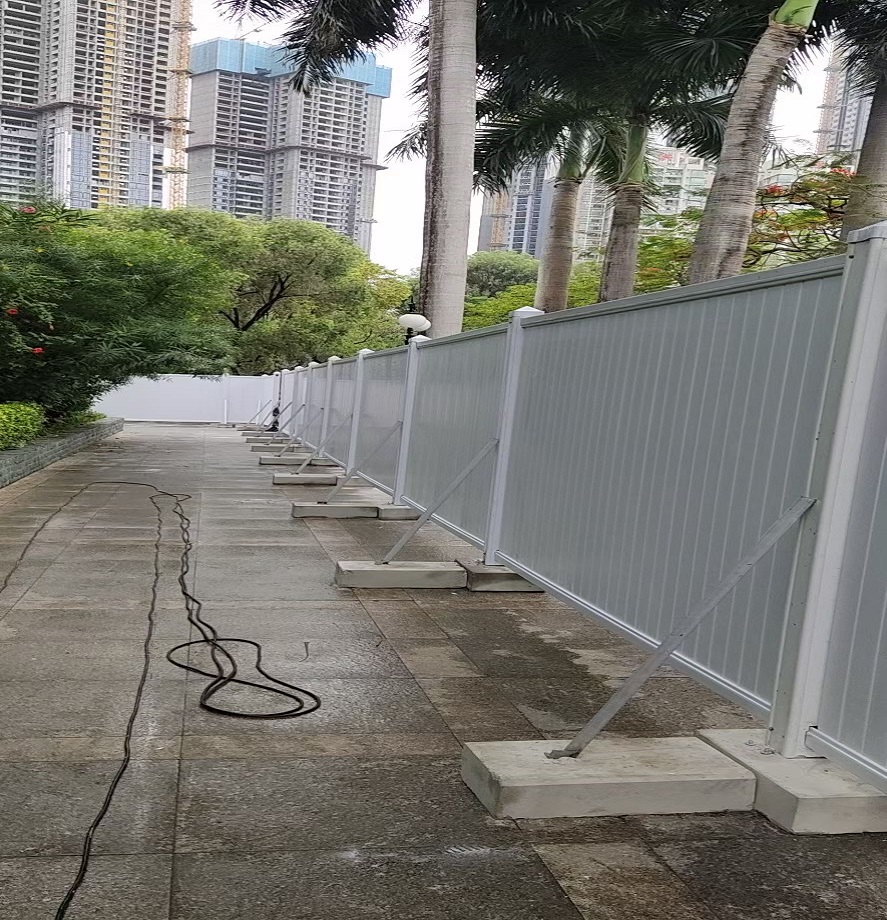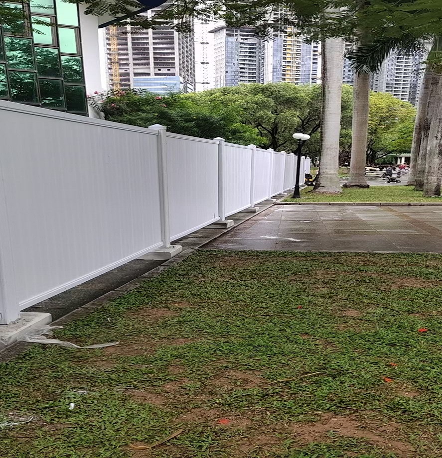 此工程所選用了深圳市旭東鋼構(gòu)公司的PVC圍擋。深圳PVC圍擋為施工臨時(shí)圍擋,價(jià)格便宜,經(jīng)濟(jì)實(shí)用,適用于工期比較短的工程,一般情況是半年(6個(gè)月)以下的工程。PVC圍擋的材料屬于阻燃不易燃燒的,相比以前的彩鋼夾芯板圍擋更為牢固美觀,PVC圍擋的立柱、橫梁內(nèi)部都有方通鋼管內(nèi)襯以增加圍擋的強(qiáng)度,該圍擋的面板是由10(28.5mm)內(nèi)部鏤空的純PVC板拼裝而成,其節(jié)約庫存空間,運(yùn)輸方便,安裝簡(jiǎn)單,是短期工程,臨時(shí)施工工地的首選。